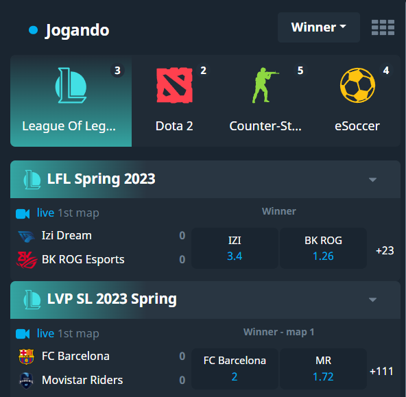 Há muitas apostas para jogos de eSports, como Valorant, StarCraft 2, Rocket League, Rainbow Six, King of Glory, e Call of Duty, entre outros.